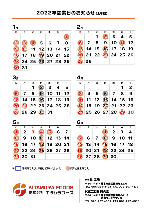 2022年営業日のお知らせ(上半期)